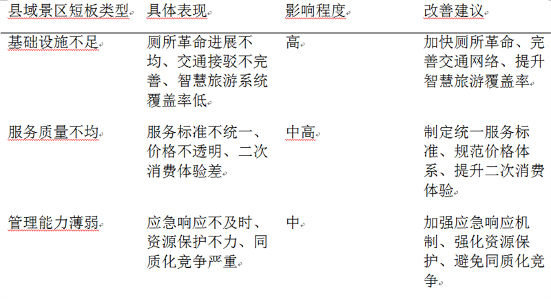 设备方面,部门县域景区存正在办理畅后问题。如固原市六盘山景区(2019年案例)存正在设备老化、垃圾清理不及时等问题,虽为旧数据但反映共性短板;新疆野三坡景区成长到昌盛期间年欢迎旅客量高达600多万人次,但过度开辟导致根本设备扶植和资本整合收购投入过大,开辟商被一家建建工程公司申请破产沉整,景区最终。这些案例表白,县域景区正在根本设备和办理上存正在较着不脚,限制了可持续成长。